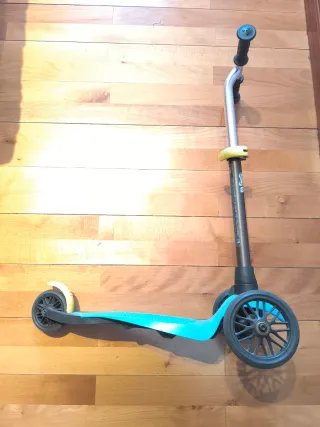 Patinete de tres ruedas de Decathlon, ideal para los más pequeños. Su diseño es ligero y fácil de manejar. - Color azul y amarillo. - Ruedas de goma. - Manillar ajustable.