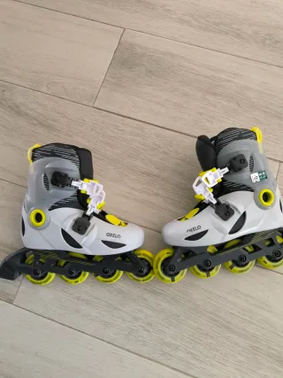 Estan con dos usos contados!! NUEVISIMOS!! Se aprecia claramente en las fotos que estan relucientes. Tienen dos puestas. Se vende por no darle uso. El freno como veis esta sin gastar, tiene cierta marca de las dos veces que use los patines y ya. Compradas en el decathlon por 59,99€ Las Vendo por 45€ Talla de la 35 a la 38. . A recoger zona Móstoles central.