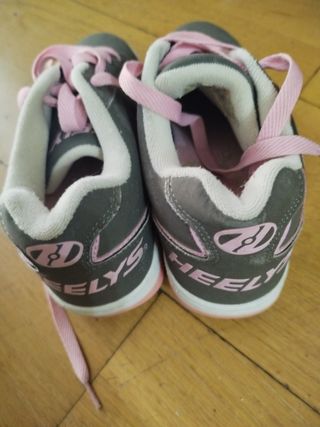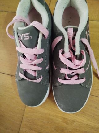 Botines con ruedas de la marca Decathlon en talla 38. Son de color gris con cordones rosas. - Cierre con cordones. - Diseño deportivo.