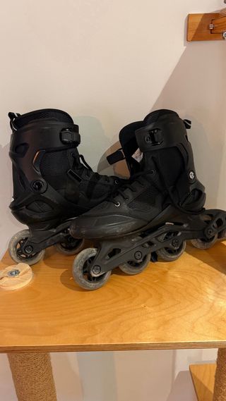 Patines en línea de color negro, talla 43. - Marca Decathlon. - Algunas marcas por caídas pero han sido usados literalmente 4 veces antes de rendirnos en el arte del patinaje 😅. Tengo también protecciones y un pantalón corto con almohadillas para amortiguar impactos. 35 € solo los patines, 50€ con protecciones y pantalón.