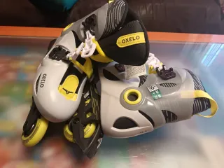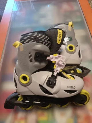 Patines en línea de la marca Oxelo, comprados en Decathlon. Son de color gris y blanco con detalles en amarillo. - Talla: 30-32. - Cierre con hebillas y velcro. - Ruedas de color amarillo.