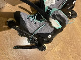 Patines en línea de Decathlon, talla ajustable de 34 a 36. Ideales para iniciarse en el patinaje. - Color verde menta y blanco. - Cierre con velcro y hebilla. - Ruedas de color rosa pálido.