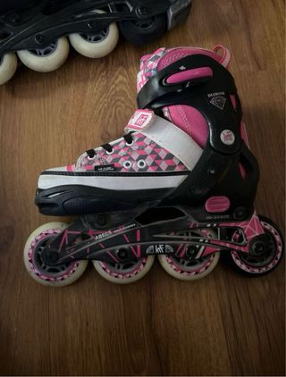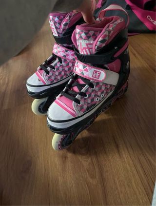 Patines en línea de Decathlon. - Talla ajustable de 35 a 38. - Diseño en color gris y rosa. - Ruedas de color blanco con detalles rosas. Cada par se entrega con bolsa y protectores