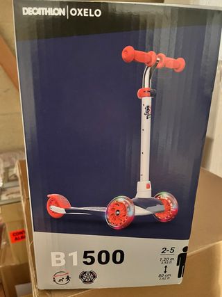 Patinete infantil modelo B1500 de Oxelo, ideal para niños de 2 a 5 años. Cuenta con ruedas que se iluminan al rodar. - Marca: Oxelo (Decathlon) - Modelo: B1500 - Rango de edad: 2-5 años - Altura recomendada: 1.20 m (3.93 ft) - Altura del manillar: 80 cm (2.62 ft) - Ruedas con luces LED
