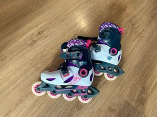Patines en línea ajustables Oxelo Play 3 en color rosa y morado. Decathlon. En perfecto estado. Las ruedas se pueden colocar en línea o 1 delante y 2 ruedas juntas atrás como se ve en las fotografías. Ideal para iniciarse y aprender. - Talla regulable de 26 a 28. - Diseño infantil con ruedas. - Cierre de velcro y hebilla.