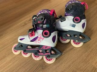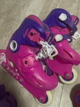 Patines en línea rosas y morados de la marca Oxelo, talla 28-30. Con signos de uso, pero muy poco usados. - Diseño infantil con estrellas y mariposas. - Cierres de de hebilla, funcionales al 100%. - Ruedas y freno en buen estado