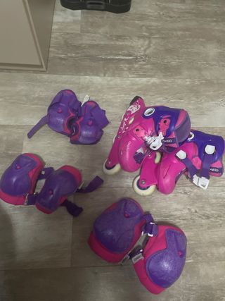 Patines en línea ajustables para niñas de la marca Decathlon Oxelo, modelo Play 3. * Protecciones para muñeca y codos Disney Frozen oficiales prácticamente nuevas. Usados 4 días, tiene roces estéticos del uso - Color rosa con detalles en morado. - Talla ajustable de 28 a 30. - Cierre con velcro y hebilla.