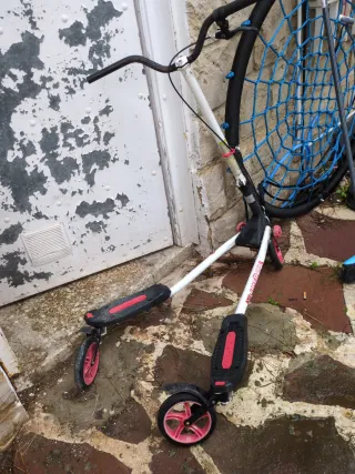 Se vende patinete doble Ideal para paseos. Es muy bueno para la coordinación porque para avanzar hay que balancearse. Tiene algunos rasguños como se ve en la foto. Está a un precio muy bueno porque me haría ilusión que algún niño lo disfrutara mañana 😊 - Diseño de doble plataforma. - Con sistema de freno.