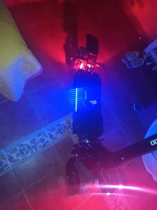 Patinete eléctrico con luces LED rojas. - Diseño robusto en color rojo y negro. - Ruedas todoterreno. patinete eléctrico prácticamente nuevo solo se cargó 2 veces velocidad de 71 kh muy potente motor doble patinete tipo motocross
