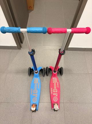 Se venden dos patinetes Maxi Micro, uno en color rosa y otro en azul. Ideales para niños. - Patinete rosa con ruedas delanteras dobles. - Patinete azul con ruedas delanteras dobles. - Manillar ajustable en altura. - Plataforma ancha para mayor estabilidad.