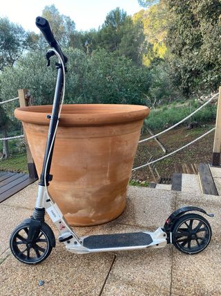 Vendo patinete de la marca Oxelo con ruedas de gran diámetro, ideal para trayectos urbanos ya que absorbe mucho mejor las irregularidades del terreno y es más veloz que los modelos estándar. Características principales: Ruedas grandes: Neumáticos de mayor tamaño en color azul que ofrecen un desplazamiento muy cómodo y fluido. Sistema de plegado rápido: Se dobla fácilmente para guardarlo en cualquier sitio o llevarlo en el bus. Manillar ajustable y ergonómico: Altura regulable para que lo usen tanto niños como adultos. Incluye puños de espuma para un agarre cómodo. Freno de pie: Guardabarros trasero que actúa como freno