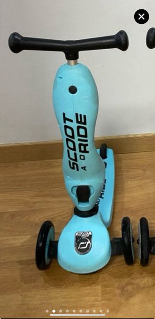 Patinete infantil de la marca Scoot and Ride, convertible en bicicleta. - Diseño en color azul. - Ruedas delanteras dobles para mayor estabilidad. - Manillar ajustable en altura.