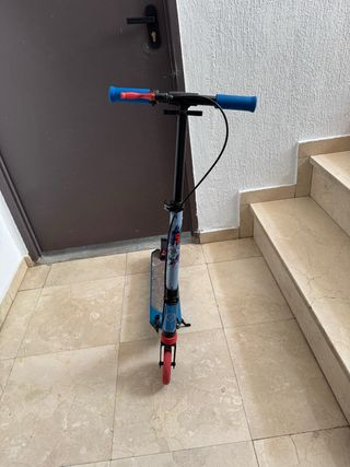Patinete Oxelo de Decathlon en color azul. - Manillar con puños azules y rojos. - Ruedas delanteras rojas. - Plataforma con diseño gráfico. - Doble freno. - Ajustable manillar en altura. - Máximo 100kg.