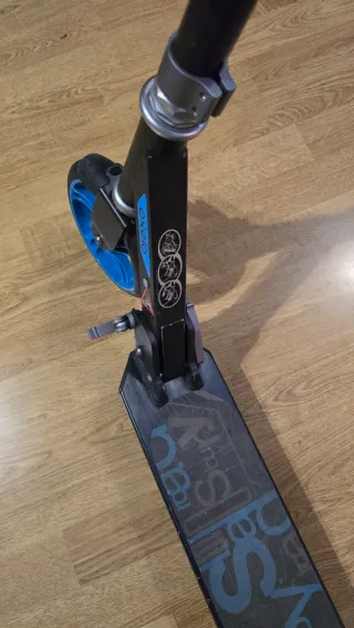 Patinete de la marca Oxelo en color negro con detalles en azul. - Manillar con puños de goma. - Plataforma antideslizante. - Ruedas con llantas de color cobre. esta en perfecto estado el manillar un poco doblado pero funciona perfectamente