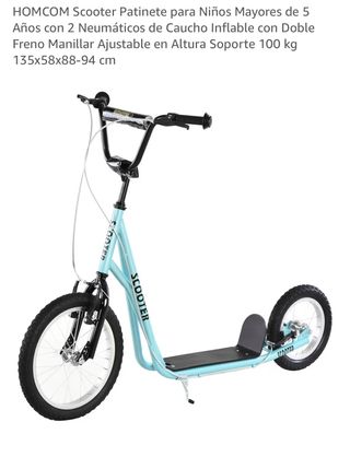 Patinete HOMCOM para niños mayores de 5 años. Cuenta con dos neumáticos de caucho inflable y freno manillar. - Doble neumático de caucho inflable. - Freno manillar. - Altura ajustable. - Soporta hasta 100 kg. - Medidas: 135x58x88-94 cm.