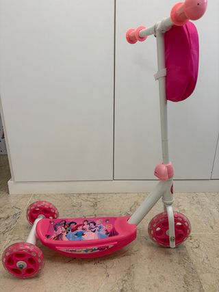 Patinete infantil con diseño de princesas Disney. - Color rosa. - Marca: Mondo Toy. - Tres ruedas para mayor estabilidad. Durable: el marco de acero y la construcción robusta hacen que el scooter sea muy resistente a los impactos. Peso soportado hasta 20 kilogramos. Fácil de manejar: el sistema de dirección inmediata y la rueda trasera doble le permiten conducir el scooter de manera práctica y funcional. Diseñado para su uso a partir de los 2 años de edad. Estable: el reposapiés antideslizante y las empuñaduras rígidas le permiten usar el scooter, lo que aumenta la seguridad y la estabilidad al conducir.