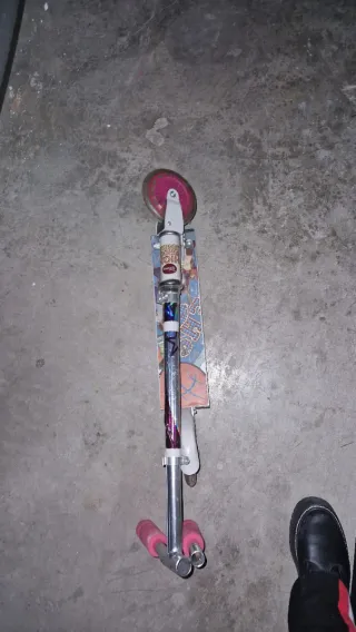 Patinete de dos ruedas con un diseño llamativo en color rosa y negro. - Manillar negro con puños de goma. - Base con diseño de estrellas y motivos florales. - Ruedas negras. Un poco desgastado donde se apoyan los pies pero funciona perfectamente, precio negociable.