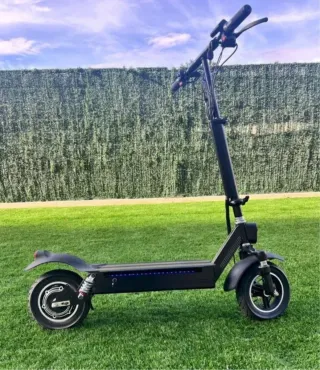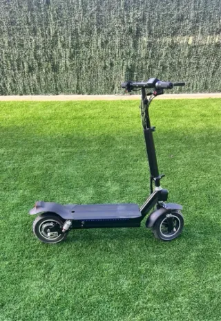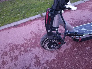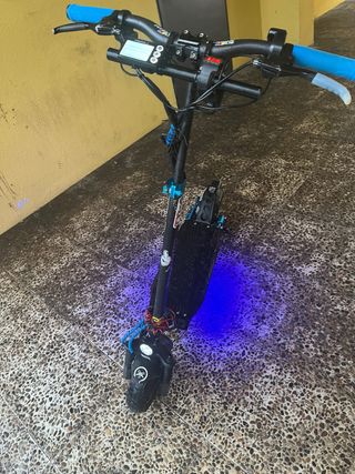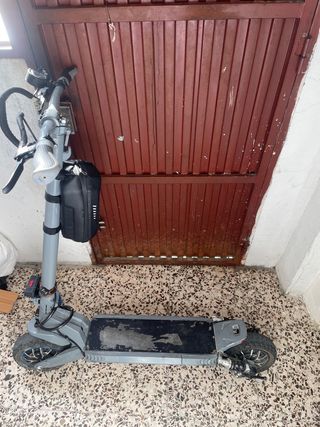 Patinete eléctrico de color gris, con un diseño moderno y funcional. - Manillar ajustable. - Bolsa de transporte negra. - Ruedas delanteras y traseras. Bateria ampliada a 60V y 30A Solamente falta acabar poner luz delantera y trasera