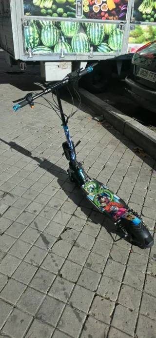 Patinete eléctrico con un diseño único y llamativo. - Manillar negro con detalles azules. - Plataforma con diseño de Dragon Ball. - Ruedas negras. Velocidad max. 70kmh