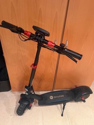 Patinete eléctrico Zhweel en color negro. Diseñado para desplazamientos urbanos. 211 kilometros esta como nuevo alcanza 30km/h - Manillar con luces LED azules. - Plataforma con diseño texturizado. - Ruedas con detalles en rojo. - Pata de apoyo integrada.