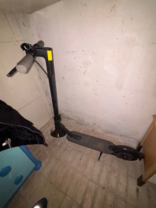 Patinete eléctrico de color negro, ideal para desplazamientos urbanos. - Diseño plegable para facilitar su transporte. - Rueda delantera con detalles amarillos. - Rueda delantera pinchada - Bateria en buen estado - Tengo un poco de prisa en venderlo por lo que es negociable