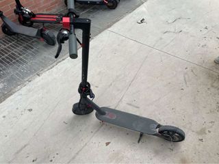 Patinete eléctrico de color negro, ideal para desplazamientos urbanos. - Diseño plegable para facilitar su transporte y almacenamiento. - Ruedas con detalles en rojo. - Plataforma antideslizante. -con el cargador incluido que esta nuevo
