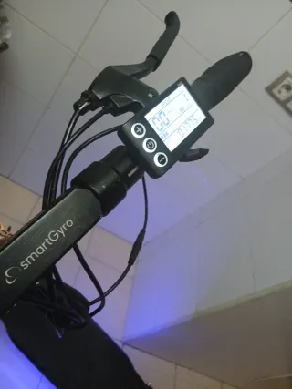 Patinete eléctrico SmartGyro con un diseño moderno y luces LED azules. - Manillar ajustable. - Ruedas neumáticas. - Freno de disco. - batería cambiada hace poco. - falta cambiarle algún cosita por el uso pero está listo para usar. Más inf mensaje, negociable.