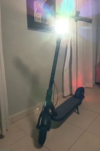 Patinete eléctrico en buen estado, ideal para desplazamientos urbanos. Cuenta con luces delantera y trasera para mayor visibilidad. - Diseño plegable para facilitar su transporte. - Plataforma antideslizante para mayor seguridad. - Ruedas resistentes para un rodaje suave.