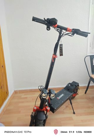 Patinete eléctrico de color negro con detalles en rojo y marrón. - Manillar ajustable. - Bolsa de transporte negra. - Ruedas delanteras y traseras. - dual motor 1000w - factura de compra Terminante luces delantera i trasera Acepto canvio por otro patin aunque tenga que poner dinero