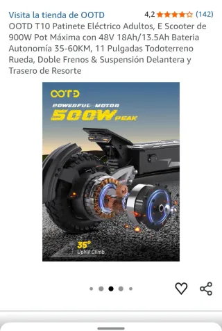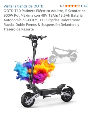 Patinete eléctrico OOTD T10 para adultos, ideal para desplazamientos urbanos y todoterreno. - Potencia máxima de 900W. - Batería de 48V 18Ah/13.5Ah. - Autonomía de 35-60KM. - Ruedas de 11 pulgadas. - Doble sistema de frenos. - Suspensión delantera y trasera de resorte.