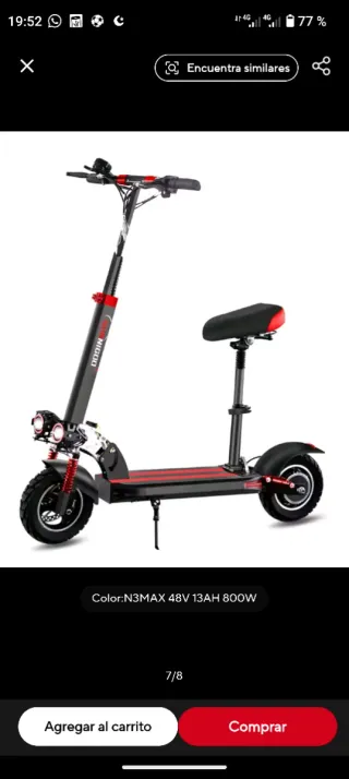 Patinete eléctrico en color negro y rojo, con asiento incluido. - Diseño moderno y deportivo. - Ruedas todoterreno. - Doble faro delantero. - Suspensión delantera y trasera. Patinete eléctrico todoterreno en excelentes condiciones. ¡Perfecto para tus aventuras urbanas! - Motor Brushless de 800W. - Batería de litio 48V 13Ah. - Velocidad máxima de 45 km/h. - Autonomía de 35-40 km. - Llantas todoterreno de 10 pulgadas. CONTACTO WHATSAPP: 621068324