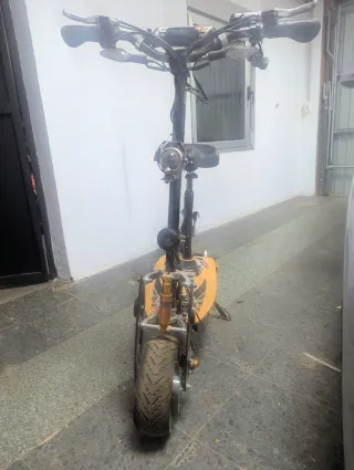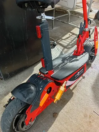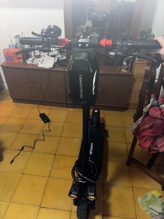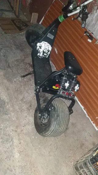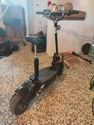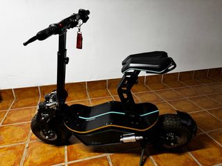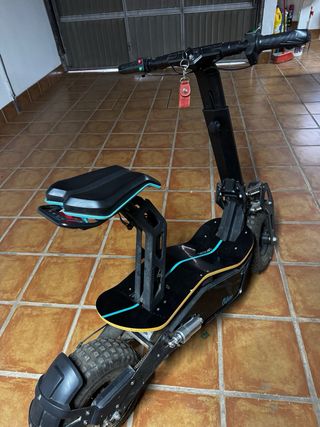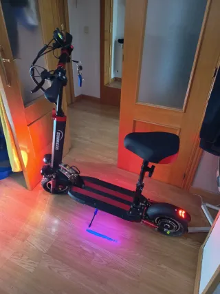 Patinete eléctrico marca sunnigoo Muy potente y veloz, velocidad máxima 70km/h en 3 modos, incluye asiento que va atornillado aunque actualmente está desmontado - Pantalla digital. - Manillar con puños negros. - Frenos en el manillar. -Luz delantera con mucha visibilidad -Lus trasera roja de freno -intermitentes -Bocina -Bombín de arranque con llave/ anti robo Regalo candado valorado en 20€ y soporte para móvil valorado en 20€ de decathlon. Abstenerse de ofertas absurdas