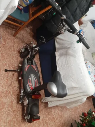 Patinete eléctrico en color negro, ideal para desplazamientos urbanos. Incluye casco protector. - Diseño moderno y funcional. - Ruedas resistentes para mayor durabilidad -Tres niveles de velocidad 1-25km/h 2-35km/h 3-45km/h Viene con un asiento por si se quisiera poner. Tiene algunos defectos del uso. La batería se carga en 6-8h *Escucho ofertas Se vende porque me compré una moto.