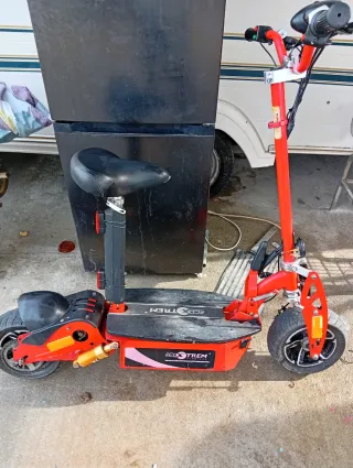 Patín eléctrico con asiento y suspensión. - Asiento acolchado con logo ECO XTREM. - Doble amortiguador trasero rojo. - Rueda delantera ancha. - Freno de disco trasero. En muy buen estado ,preguntar cualquier duda