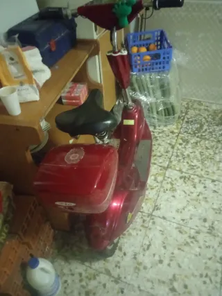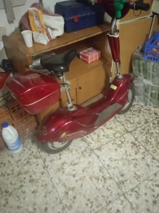 Patinete eléctrico de color rojo brillante, ideal para desplazamientos urbanos. Su diseño es moderno y funcional.cambio.por un telefono movil bueno o vender - Asiento cómodo. - Cesta de almacenamiento trasera. - Ruedas resistentes.