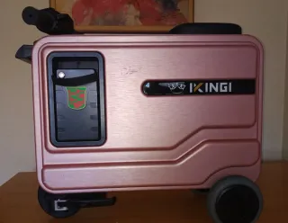 Maleta de cabina, con ruedas que se convierte en patinete eléctrico. - Color rosa metalizado. - Asa extensible. - Asiento integrado. - Ruedas para facilitar el transporte. Maleta-patinete eléctrica IKINGI. Está en muy buen estado. El único problema que tiene es que el manillar no se mantiene arriba pero no impide su manejo. Maleta/patin/inteligente marca "Ikingi" modelo FX-2Pro. Tipo Airwheel. Precio nuevas mas de 500€. Medidas aprox. 55cm