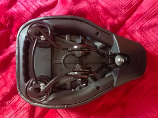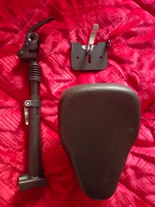Conjunto de sillín y tija para patinete eléctrico. - Sillín de cuero sintético negro. - Tija ajustable en altura con resorte. - Soporte de montaje incluido. -Solo tiene esas pequeñas entradas en la silla porque tenia el soporte encima (nunca se a usaso).