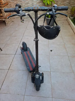 Se vende Patinete eléctrico con un diseño deportivo en negro y detalles a rayas rojas. Incluye un casco negro para mayor seguridad y sillín . Tel 609 65 24 69 wahtsapp y llamadas