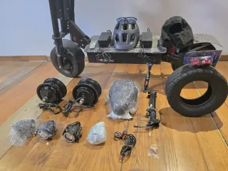 El lote se vende todo junto e incluye: 2 motores (cada uno ya cuesta 500€) 4 luces LED 1 pastilla de freno 1 neumático 1 sillín + la estructura para ponerlo 1 cambio de marcha 2 protecciónes de tornillos anticaída 2 cargadores 1 casco 1 pasamontañas 1 gafa protectora Conservo también la caja original del patinete.