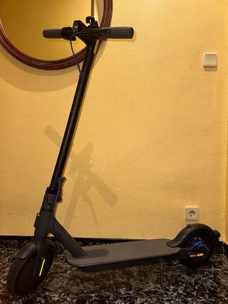 Patinete eléctrico Mi Scooter en color negro. Pese al tiempo que tiene solo se ha usado 6 meses para desplazarse y alguna ocasión puntual. El manillar y freno se encuentran en buen estado. Tiene algún arañazo del uso. Los neumáticos son rígidos; sé pinchó la rueda una vez y en lugar de repararlo se cambiaron.