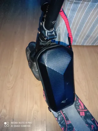 Patinete eléctrico de color negro, ideal para desplazamientos urbanos. Cuenta con una bolsa de transporte frontal. - Bolsa de transporte marca WILDMAN. - Manillar ajustable. - Suspensión delantera y trasera Tiene 3300km y va como el primer día, lo único habría que ponerle pastillas nuevas de freno que son 20 euros, autonomía 40 km, velocidad máxima 40km/h pero desde el menú de la pantalla se puede poner tope para que no pase de 25km/h, luces y ruedas todo ok