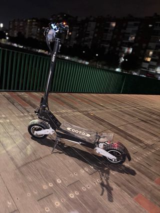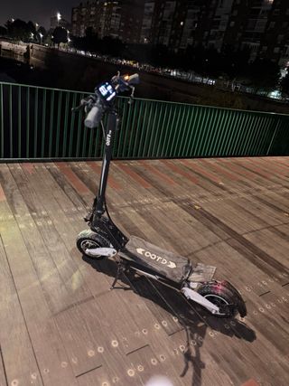 Patinete eléctrico E-TWOW Booster S+ utilizado para ir al trabajo. Alcanza los 35km/h en plano para una persona de unos 60 kg. Sube cuestas sin problema. Rueda rígida con amortiguadores para que te olvides de pinchazos y no llega a los 11kg de peso. La luz de la pantalla dejó de encender a los meses de comprado pero no afecta en nada a su uso, las luces de seguridad funcionan perfectamente.
