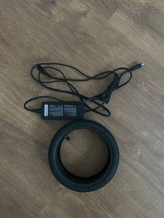 Se vende cargador y rueda para patinete eléctrico, ya que me lo robaron a menos de una semana de comprarlo. - Cargador con conector. - Rueda de goma.