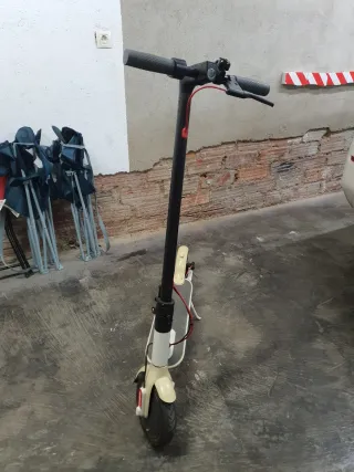 Patinete eléctrico de color blanco, ideal para desplazamientos urbanos. Diseñado para ofrecer una experiencia de movilidad ágil y cómoda. - Diseño moderno y funcional. - Ruedas nuevas. - Frenos nuevos