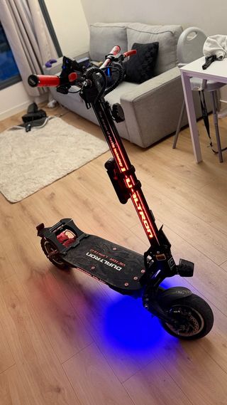 Patinete eléctrico Dualtron Thunder 1. - Diseño robusto y deportivo. - Manillar con puños azules. - Luces LED integradas en el mástil y frontal. - Controladoras nuevas con solo 500km. - Rueda delantera nueva. - Manillar de bici nuevo. - Suspensión de direccion nueva. - Frenos nutt. - Pastillas nutt de repuesto. - Luz delantera nueva.