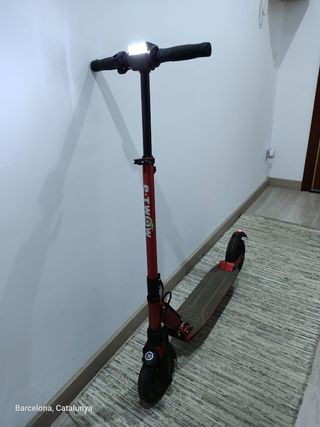 Patinete eléctrico E-TWOW Booster S+ utilizado para ir al trabajo. Alcanza los 35km/h en plano para una persona de unos 60 kg. Sube cuestas sin problema. Rueda rígida con amortiguadores para que te olvides de pinchazos y no llega a los 11kg de peso. La luz de la pantalla dejó de encender a los meses de comprado pero no afecta en nada a su uso, las luces de seguridad funcionan perfectamente.