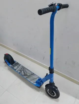 Patinete eléctrico SmartGyro en color gris con detalles en azul. - Manillar ajustable. - Ruedas delanteras y traseras. - Plataforma con diseño. - Freno trasero. Solo se ha usado para probar su funcionamiento. La caja de transporte si está un poco deteriorada.