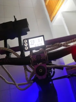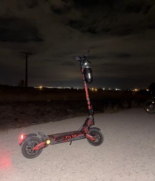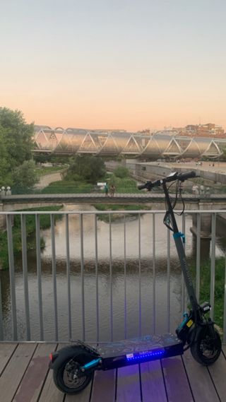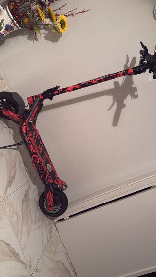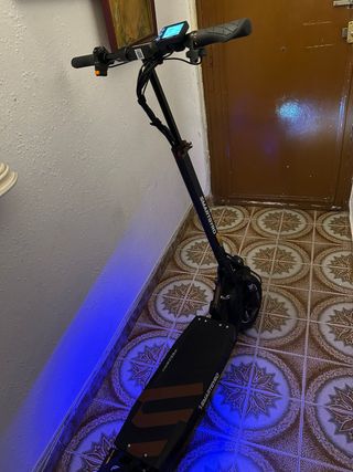 Patinete eléctrico con un diseño moderno y luces LED. - Plataforma con diseño gráfico. - Luces LED azules en la base. - Manillar ajustable. - está deslimitado, pilla en el aire unos 55km, - tiene acelerador de moto - de autonomía tiene unos 30km depende de como lo utilices - le faltan las pastillas de frenos traseras, pero tiene las delanteras y frena bien. - ( Precio negociable )