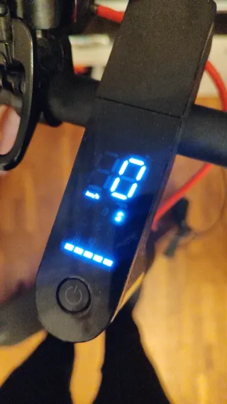 Patinete eléctrico en color negro, con pantalla digital. - Indicador de batería. - Indicador de velocidad en km/h. - Modo deportivo (S). - Conexión Bluetooth. Le falta arreglar un pinchazo trasero