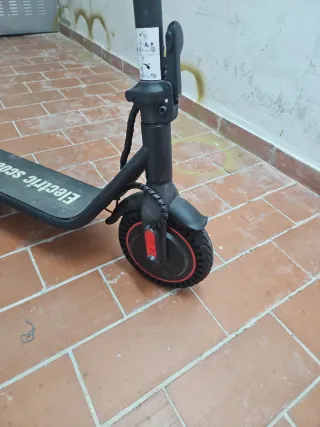 Patinete eléctrico de color negro, ideal para desplazamientos urbanos. Está en buen estado y funciona bien - Manillar con puños grises. - Freno manual en el manillar. - Rueda delantera visible.. Despecfectos : - Como pueden. Ver la imagen en la parte de el foco está un poco abollado . - el timbre esta un poco roto .